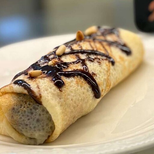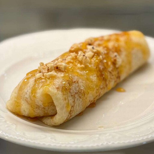 блинчик, бананы, арахисовая паста, грецкий орех, шоколадный топинг