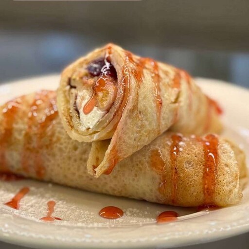 блинчик, творожный сыр, вишня, мандарины, сахарная пудра, топинг вишневый