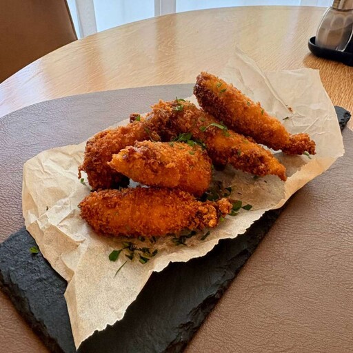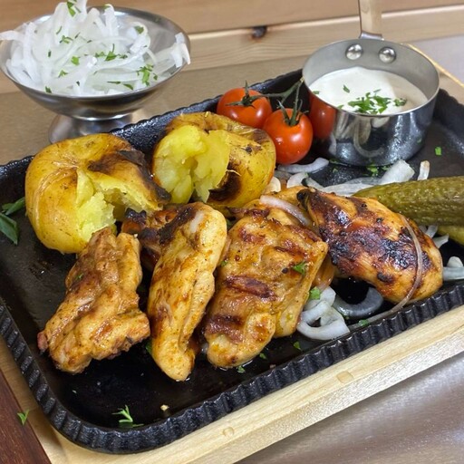 филе бедра, маринованный лук, томат черри, зелень, лепешка, картофель