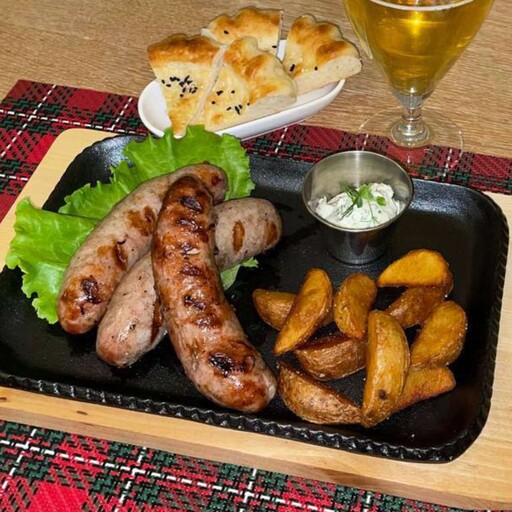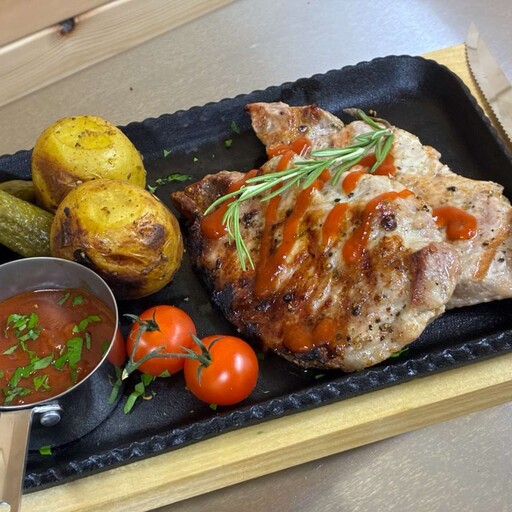 свинина шея, карбонат, лук, зелень, соус, лепешка, картофель