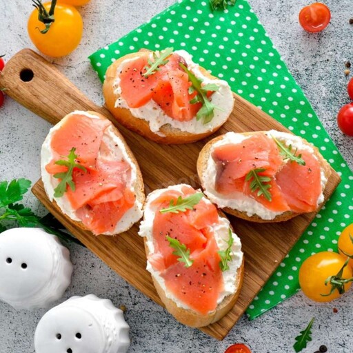 хлеб Харрис, сыр творожный, форель, огурец, маслина