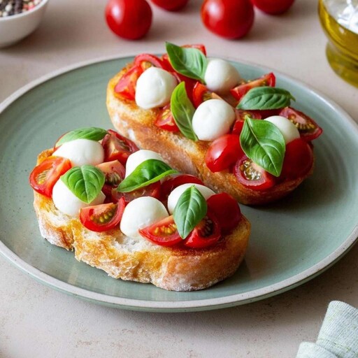 батон, томаты черри, сыр Моцарелла, зелень